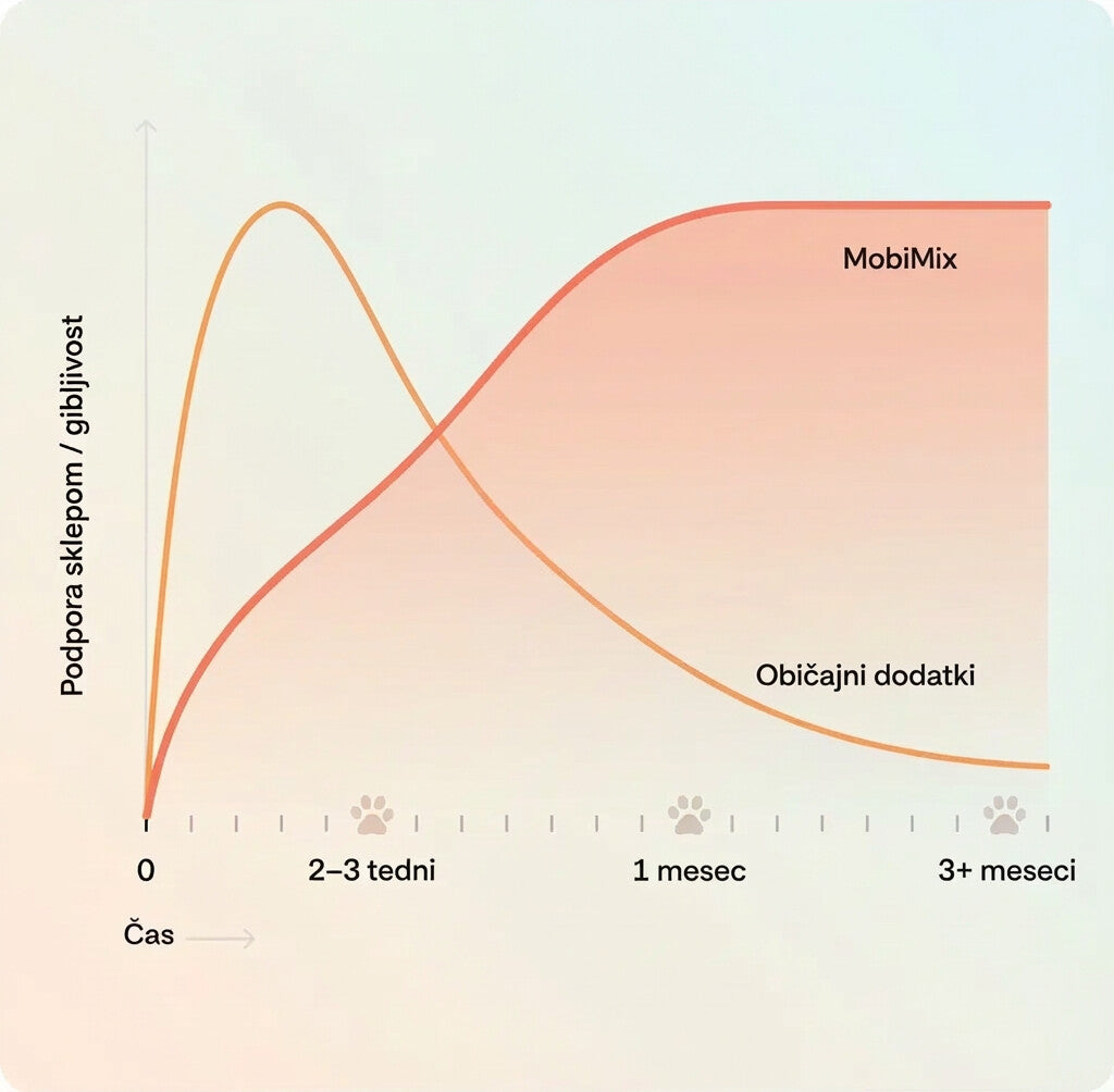 MobiMix lahko podpira sklepe, kosti in vezivna tkiva, pomaga pri ohranjanju gibljivosti ter lajša znake, kot so togost, oklevanje pri vstajanju, manjša želja po gibanju ali občasno šepanje – še posebej pri starejših, aktivnih ali večjih psih.