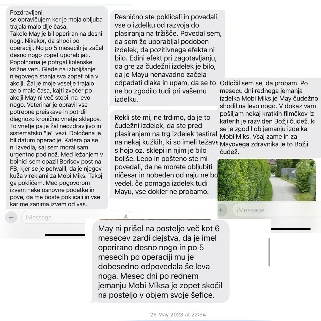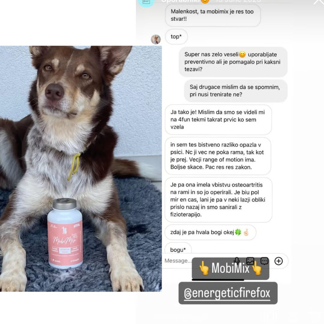 Po priporočilu sem zasledila MobiMix in psički se je stanje v roku enega meseca tako izboljšalo, da je bila sposobna ponovno iti sama po stopničkah. MobiMix me je tako zelo prepričal, da sem ga uvrstila tudi na svoje poličke, od takrat naprej ga redno priporočam strankam te pa mi dajejo pozitivne feedbacke.”